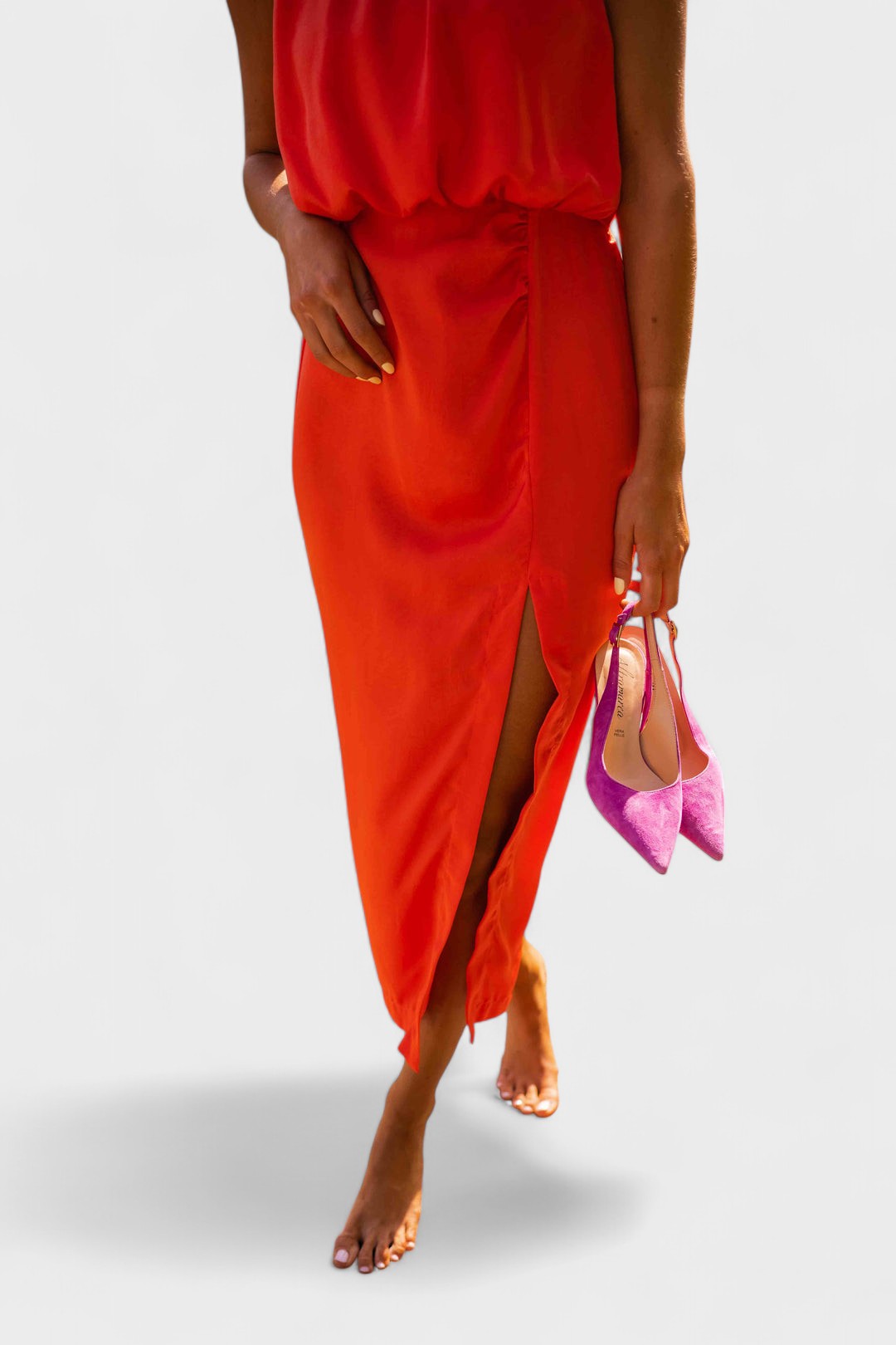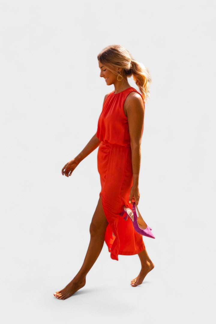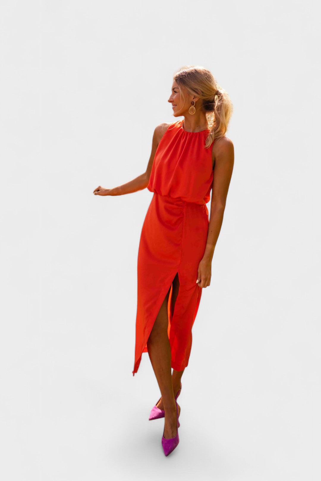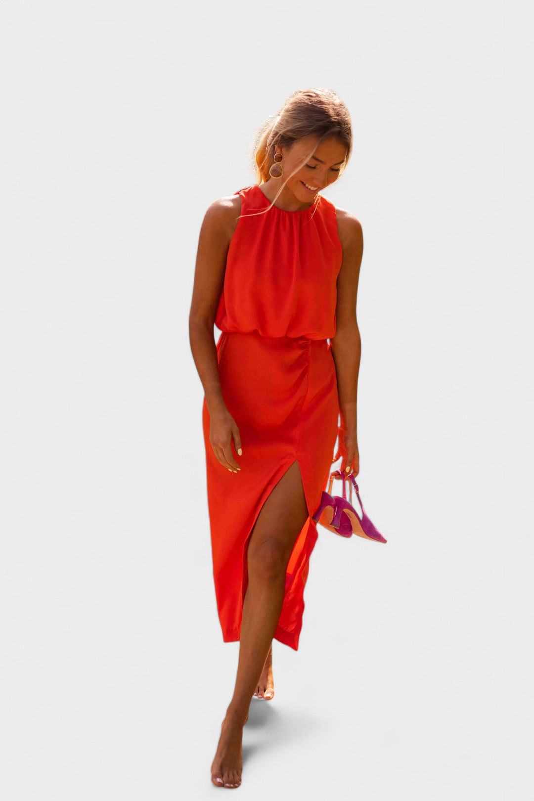 Es el vestido que combina la belleza clásica con la simplicidad moderna. Con su escote alto, corte aireado y elegante abertura en la pierna, es perfecto para los días calurosos, cuando quieres sentirte tanto cómoda como estilosa, desde paseos por la playa hasta fiestas de verano.