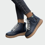 Botines deportivos en color negro con un diseño moderno y juvenil. Cuentan con cordones en color gris claro que crean un elegante contraste, así como una cremallera lateral para facilitar el calce. El suave forro interior proporciona comodidad, mientras que la suela resistente y antideslizante garantiza una pisada segura. Un par ideal para el uso diario casual con un toque de estilo.